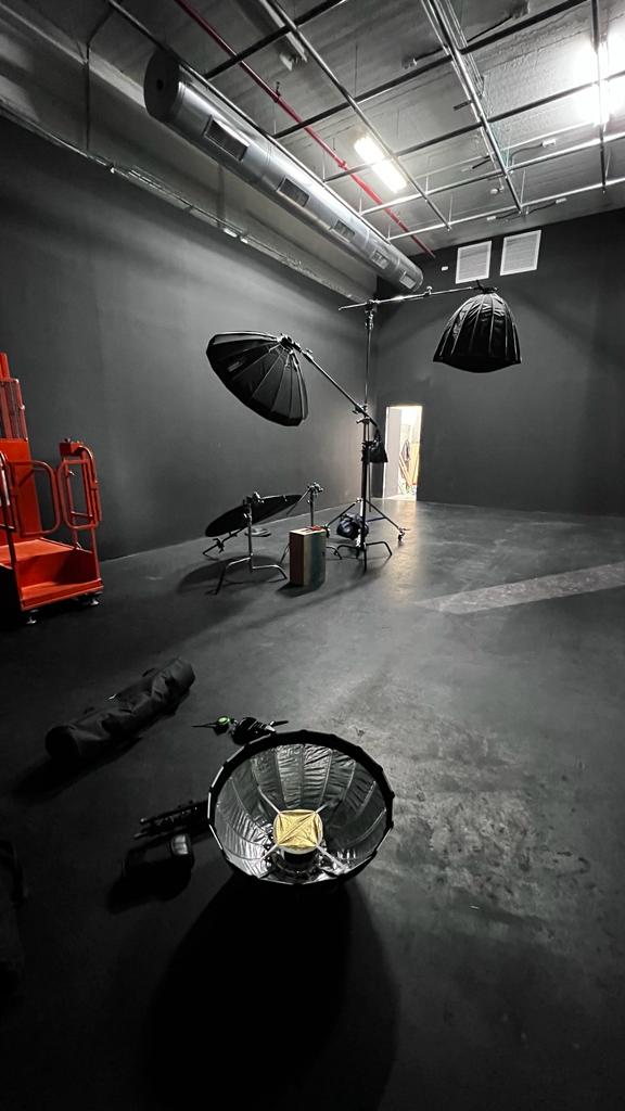 סטודיו מקצועי בגודל 60 מ"ר עם תקרות גבוהות ונקודות חשמל, מקורה במזגן תעשייתי חזק ושקט. תקרת הסטודיו מרושתת בצוגים לתליית פנסי תאורה.